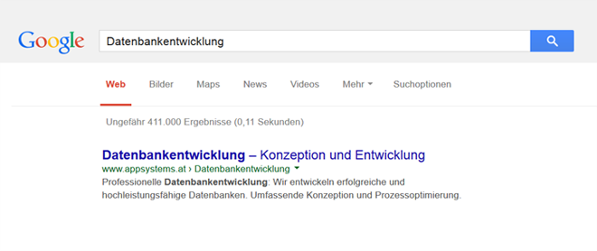 Für den Beschreibungstext zieht Google meistens die bei der Webseite hinterlegte Meta Description heran. Jedoch kann es vereinzelt vorkommen, dass nicht deren Inhalt, sondern ein anderer Textauszug der Seite beim Snippet angezeigt wird. Mitunter kann auch nur eine Zeile Beschreibungstext anstelle von zwei Zeilen angezeigt werden.